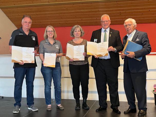 Fritz Langenhorst zeichnete Dorothee Dedenbach, Andrea Blankart, Jürgen Höper und Eugen Schmitt für langjährige hervorragende Leistungen im Verein mit der bronzenen Ehrennadel des Sportbundes aus. (Bild: Jürgen Höper, Andrea Blankart, Dorothee Dedenbach, Eugen Schmitt, Sportkreisvorsitzender Fritz Langenhorst ) Vom Kreisvorsitzenden des Fußballkreises Rhein-Ahr, Dieter Sesterheim, erhielt Florian Höper den Ehrenbrief des Fußballverbandes und Wolfgang Schütz die silberne Ehrennadel für Verdienste um den Fußball und im Verein. Für seinen langjährigen Einsatz für den SV Oberzissen wurde Patrick Adams vom SVO-Vorstand ausgezeichnet.